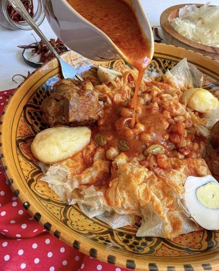 The preparation process of Chakhchoukha involves several steps, starting with the creation of the flavorful stew. The selected meat is typically sautéed with onions and spices, creating a fragrant base. Water is then added, and the mixture is allowed to simmer, resulting in a hearty, savory sauce. Once cooked, the kesra bread is torn into bite-sized pieces and mixed into the stew, allowing it to soak up the rich, aromatic flavors. This method not only enhances the taste but also showcases the artistry involved in crafting Chakhchoukha. The end result is a dish that reflects both complexity and warmth, truly encapsulating the essence of Algerian cuisine.